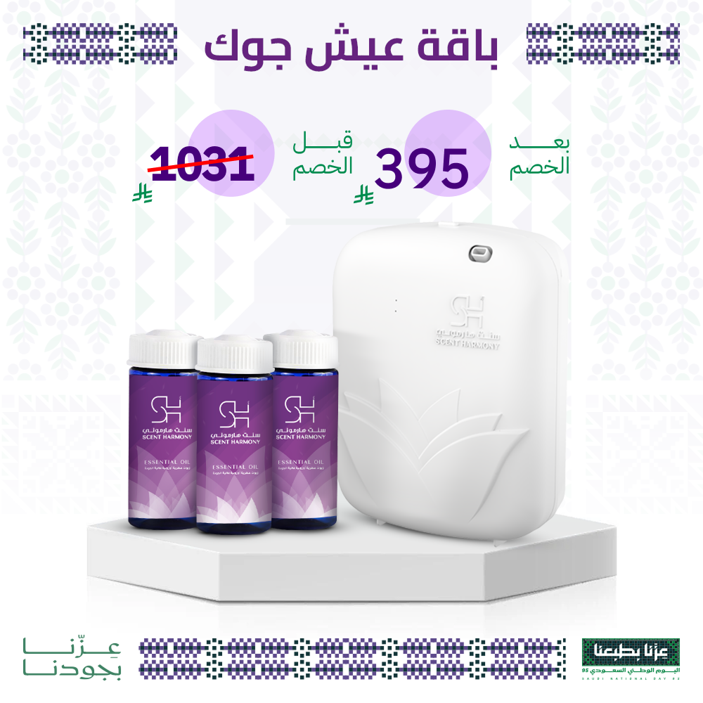 استمتع بأجواء اليوم الوطني السعودي مع باقة عيش جوك من سنت هارموني. جهاز التعطير المتنقل SH 500 الذكي سيمنحك جوًا من الانتعاش والنقاء في كل زاوية من منزلك أو مكتبك. مع تقنية النانو المبتكرة وتوزيع العطر المتساوي، سيكون لديك مساحة ممتلئة بالراحة والعطور الفاخرة. يأتي الجهاز مع ضمان سنتين وعبوتين من العطور المجانية بحجم 100 مل، لتكمل احتفالاتك بأجواء مميزة.