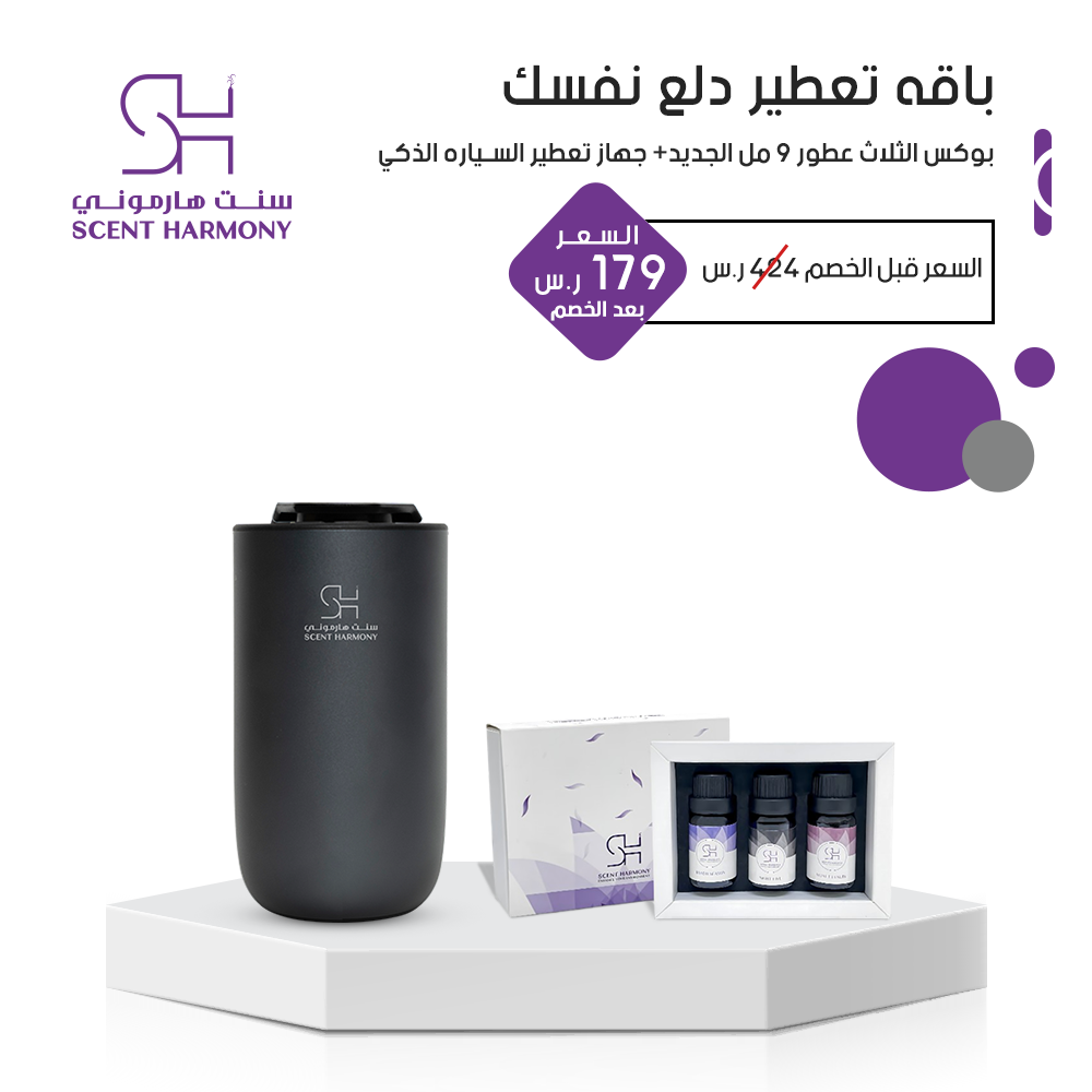 استمتع برائحة منعشة داخل سيارتك مع باقة تعطير دلع نفسك من سنت هارموني! بتصميم عصري وألوان أنيقة (ذهبي، تيتانيوم، سلفر)، يأتي الجهاز مع بوكس من 3 عطور مجانية (9 مل) لضمان جو مثالي ورائحة تدوم طويلاً. احصل عليه الآن مع ضمان سنتين!