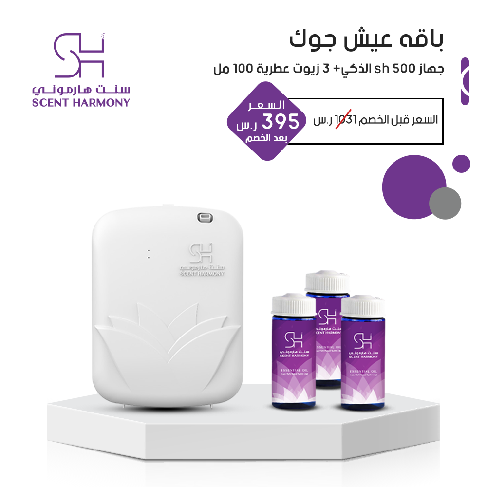اجعل بيئتك أكثر انتعاشًا مع باقة عيش جوك من سنت هارموني. بتصميم عصري باللون الأبيض، هذا الجهاز يتناسب تمامًا مع مختلف الأذواق، ويأتي مع تقنيات متطورة لضمان استمرارية الرائحة لأطول فترة ممكنة ومع 3 زيوت عطرية 100 مل. ستحصل على تجربة فاخرة تستمر طويلاً. يغطّي الجهاز مساحات تصل إلى 500 متر مكعب، مما يجعله مثاليًا للمنازل، المكاتب، أو أي مكان آخر. استمتع برائحة المنعشة طوال اليوم مع ضمان سنتين!